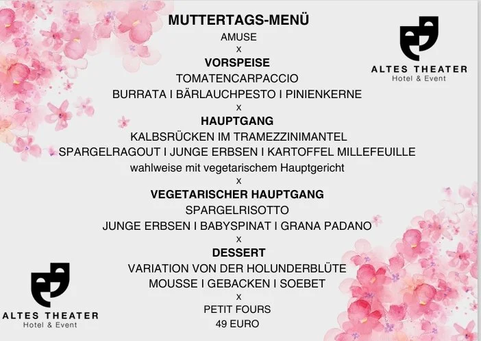 Zum Muttertag lädt das Alte Theater zu einem besonderen kulinarischen Erlebnis ein. Verwöhnen Sie die wichtigsten Frauen in Ihrem Leben mit einem exklusiven Menü, das mit viel Sorgfalt und Liebe zum Detail zusammengestellt wurde.